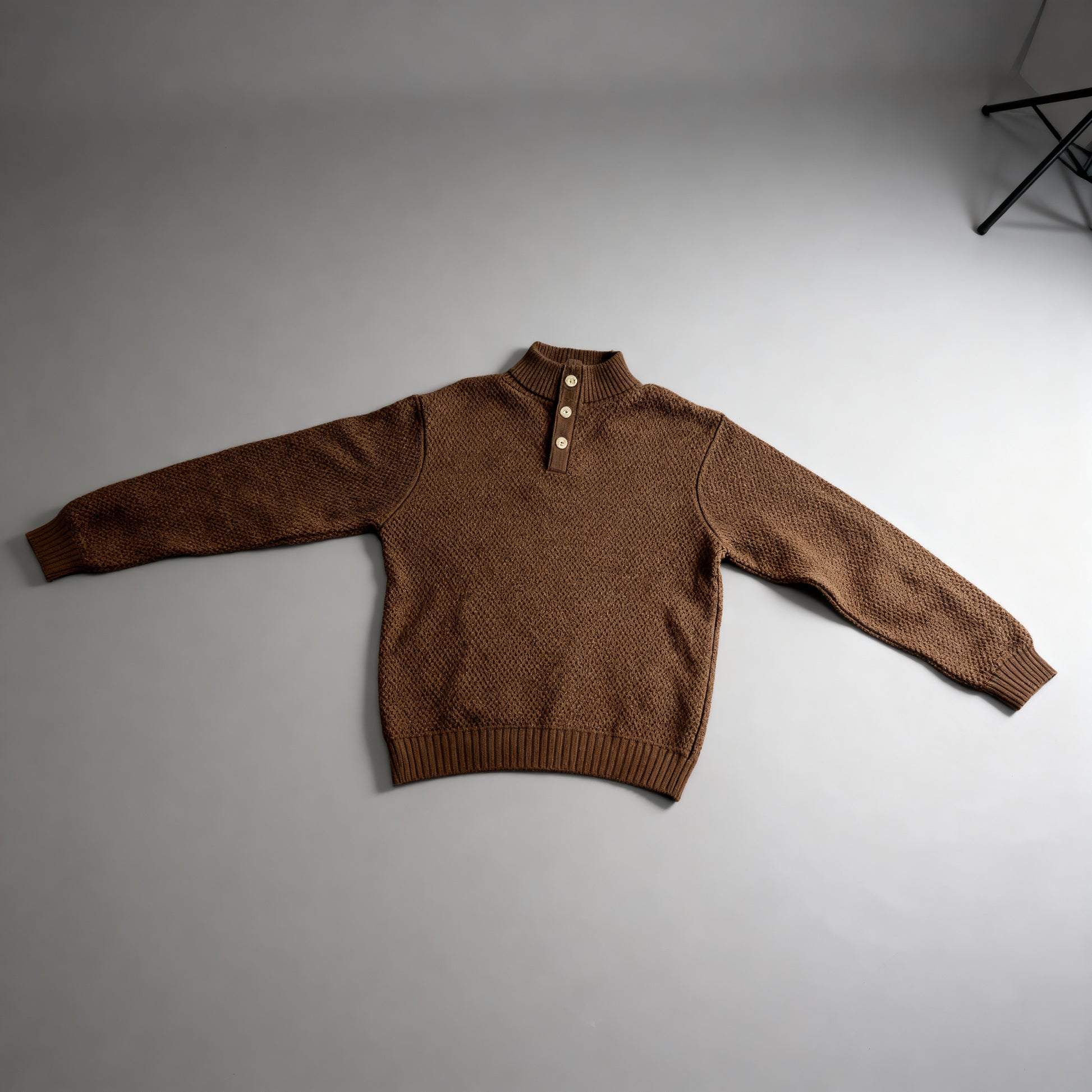 Elevate your everyday wardrobe with this Caramel Brown Textured Knit Sweater, designed for both warmth and understated elegance. Crafted from a premium cotton-blend yarn, the sweater features a distinct waffle-texture weavethat adds depth and tactile appeal. Its ribbed mock neck and four-button placket bring a refined touch while allowing adjustable comfort and layering versatility.