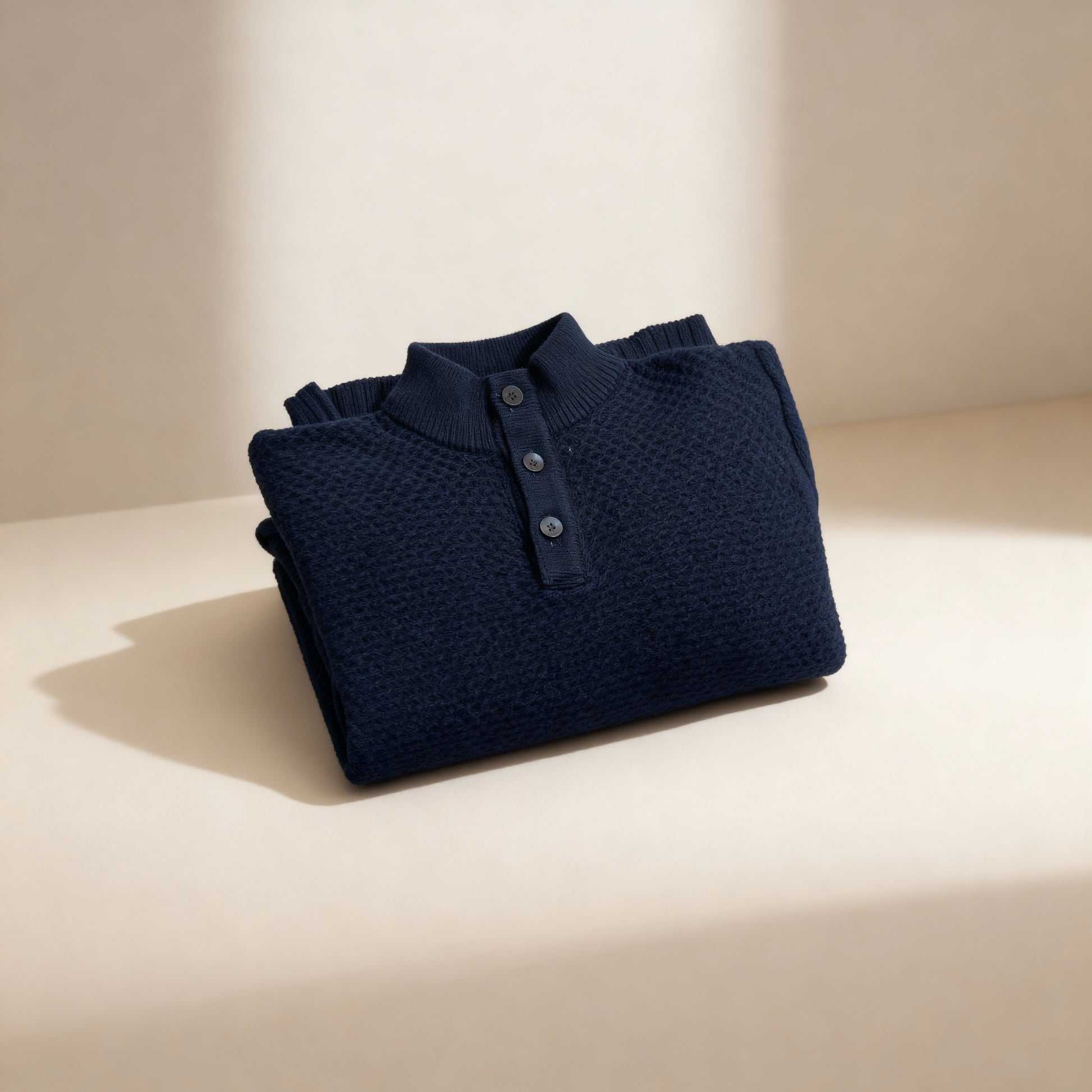 Experience effortless sophistication with this Navy Textured Knit Sweater - a timeless piece crafted for both comfort and style. Made from a premium cotton-blend yarn, it features a subtle geometric knit pattern that adds texture and depth without overpowering your look. The ribbed mock neck and three-button placket provide versatile styling options, whether layered over a crisp white tee or worn on its own for a refined casual appeal.